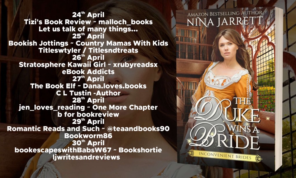 The Duke Wins a Bride is the delightful first book in the Inconvenient Brides series of steamy Regency romance books. If you like worthy heroes, strong heroines, fast-paced plots, and enduring connections, then you’ll adore Nina Jarrett’s charming novel. Can be read as a standalone book.